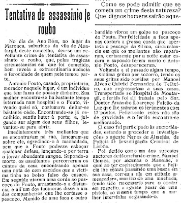 No dia de Ano Bom, no lugar da Marouca, subúrbios da vila de Montargil, deste concelho, deu-se um revoltante crime de tentativa de assassinato e roubo que, pelas trágicas circunstancias em que foi cometido, bem revela a extraordinaria audacia e ferocidade de quem nele tomou parte,